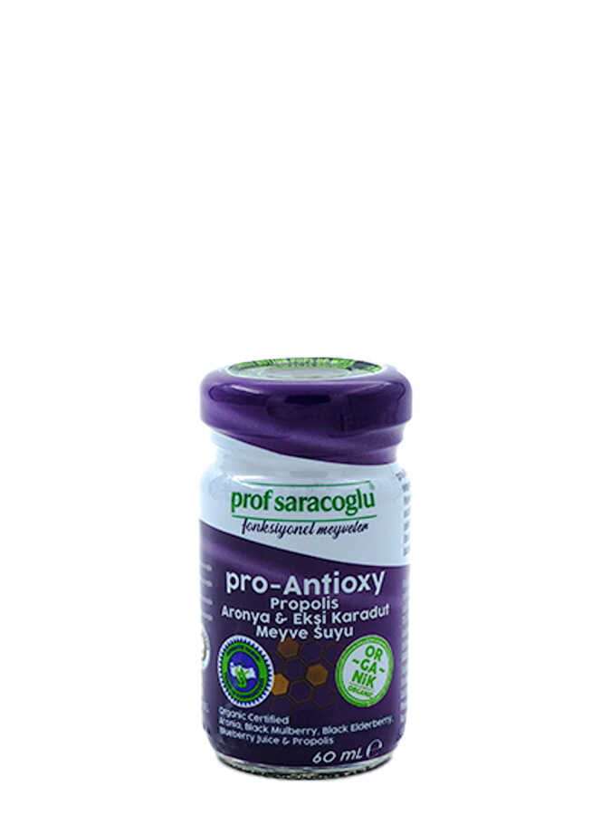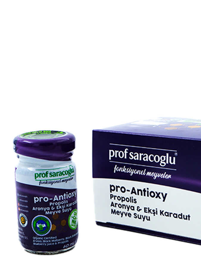Antosiyaninlerin varlığı bitkinin antioksidan kapasitesini belirleyen en önemli etmenlerdendir. Antosiyanin bakımından zengin mor meyvelerin yoğun ve güçlü etkisi ProfSaracoglu formülü ile bir araya geldi!Sağlıklı yaşam ürünü iddiasıyla özel olarak hazırladığımız Antioksidan gücü yüksek pro Antioxy, Propolis-Aronya&Ekşi Karadut başta olmak üzere değerli içeriği sayesinde bağışıklığınızın ihtiyacınızı olan günlük desteği sağlar.Organik Tarım standartlarına uygun hammaddeler ile Organik Sertifikalı olarak hazırlanan pro Antioxy, Propolis-Aronya&Ekşi Karadut, bitkilerin&meyvelerin fonksiyonel gücünü ortaya çıkartacak şekilde özel hazırlanmıştır.İçindekiler: Organik Aronya, Organik Ekşi Karadut, Organik Karamürver, Organik Yaban mersini, Propolis.Her türlü soru ve sorununuz için 0850 221 01 61 numaralı çağrı merkezimizden bizi arayabilir, www.profsaracoglu.com internet sitemiz üzerinden canlı destek alabilir ya da info@profsaracoglu.com adresine mail atabilirsiniz.